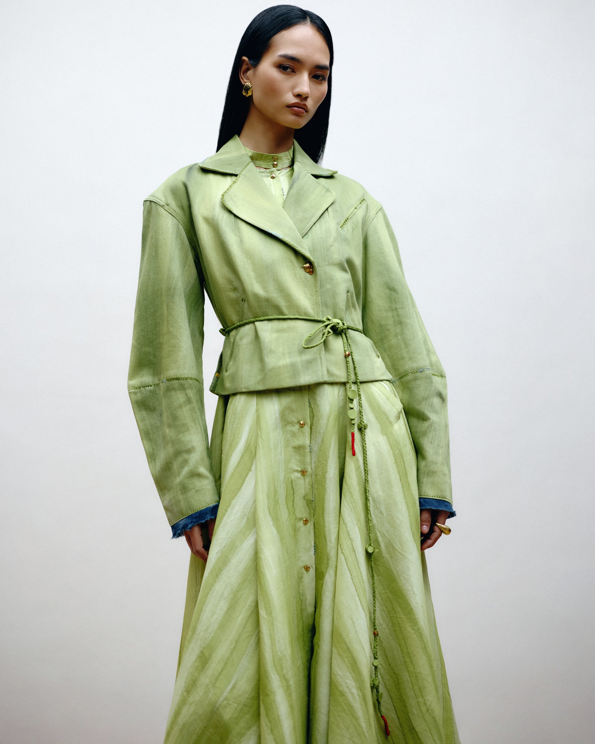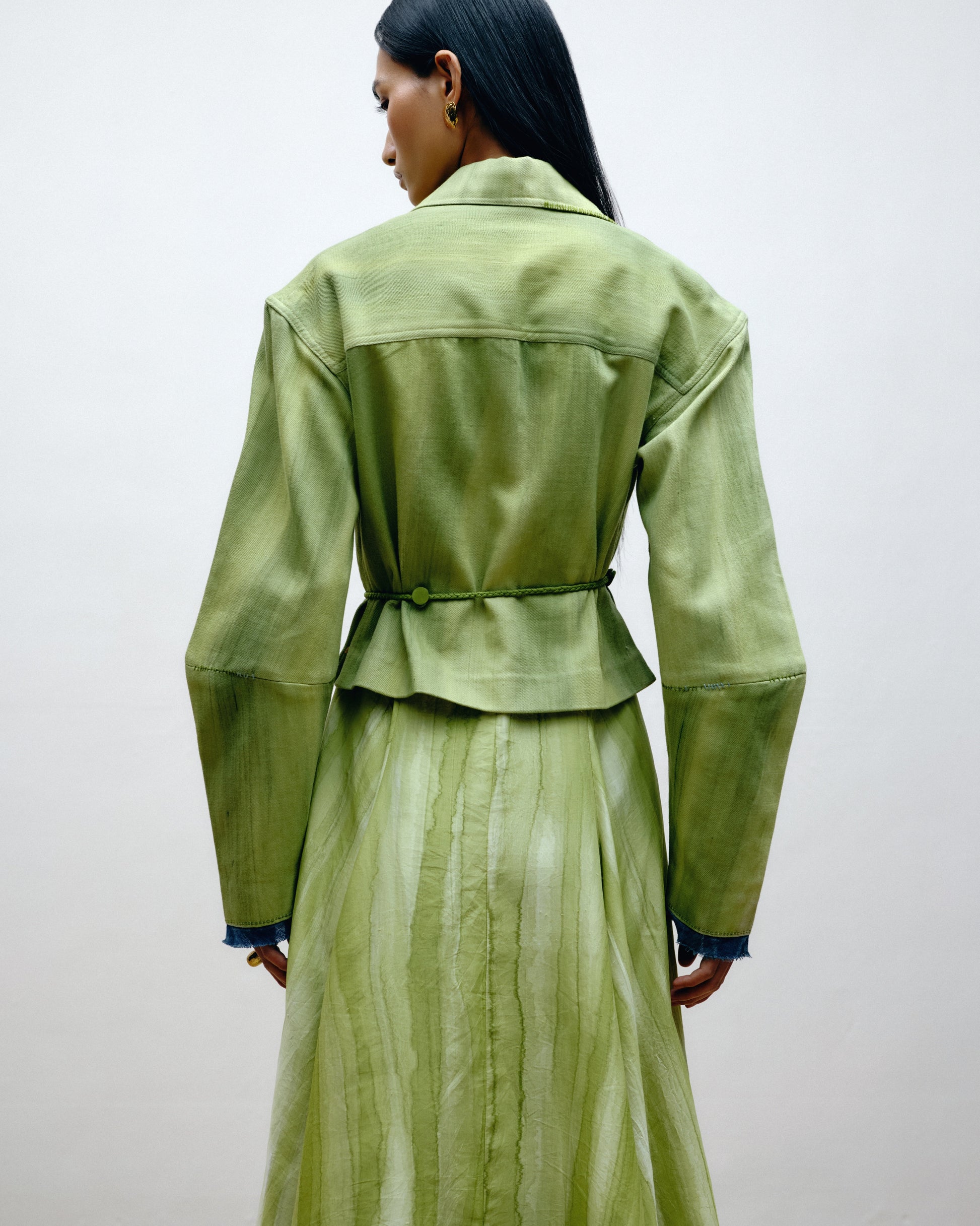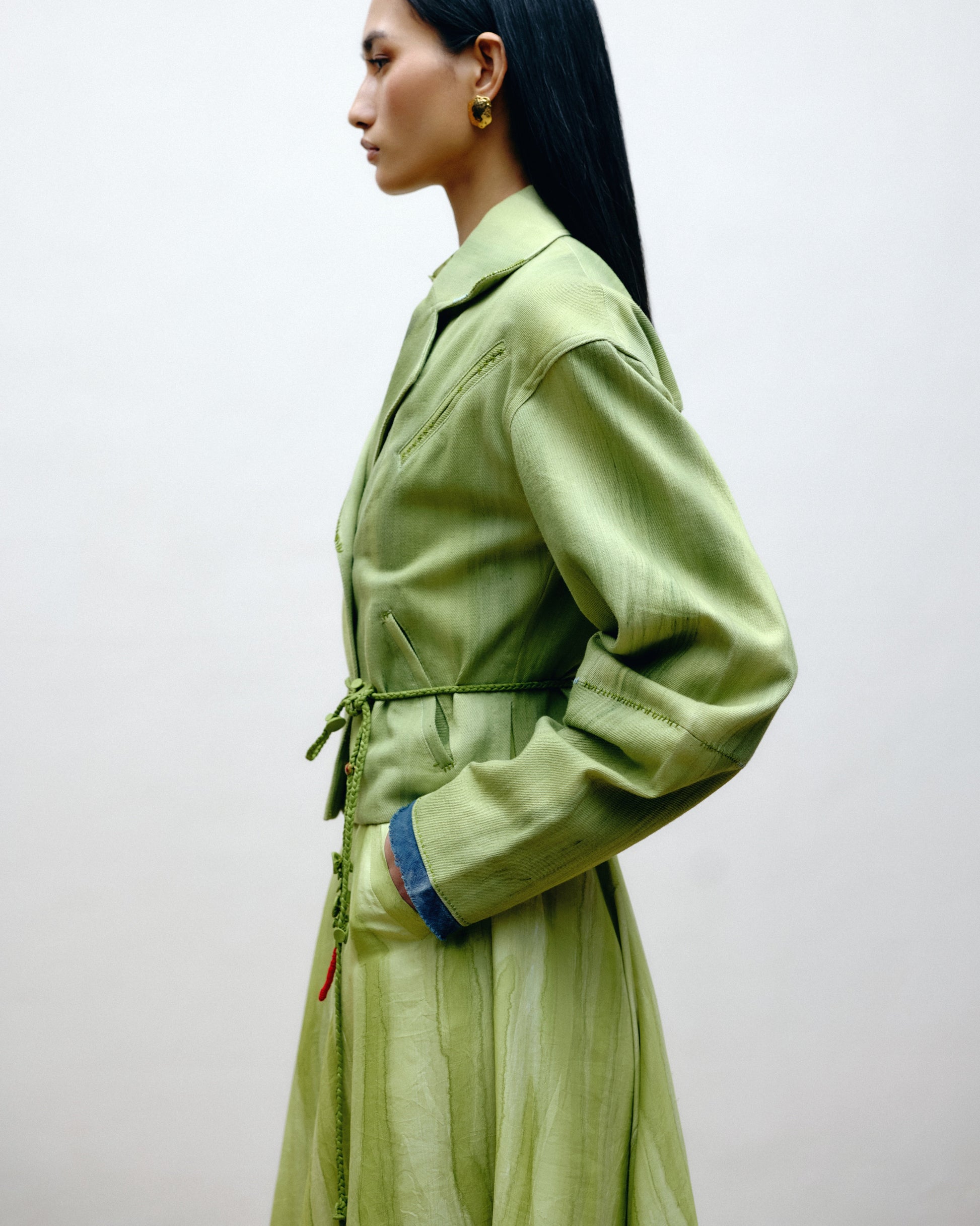 Handwoven cotton jacket with the surface hand-painted by brush, frayed edges and embroidered highlights.
