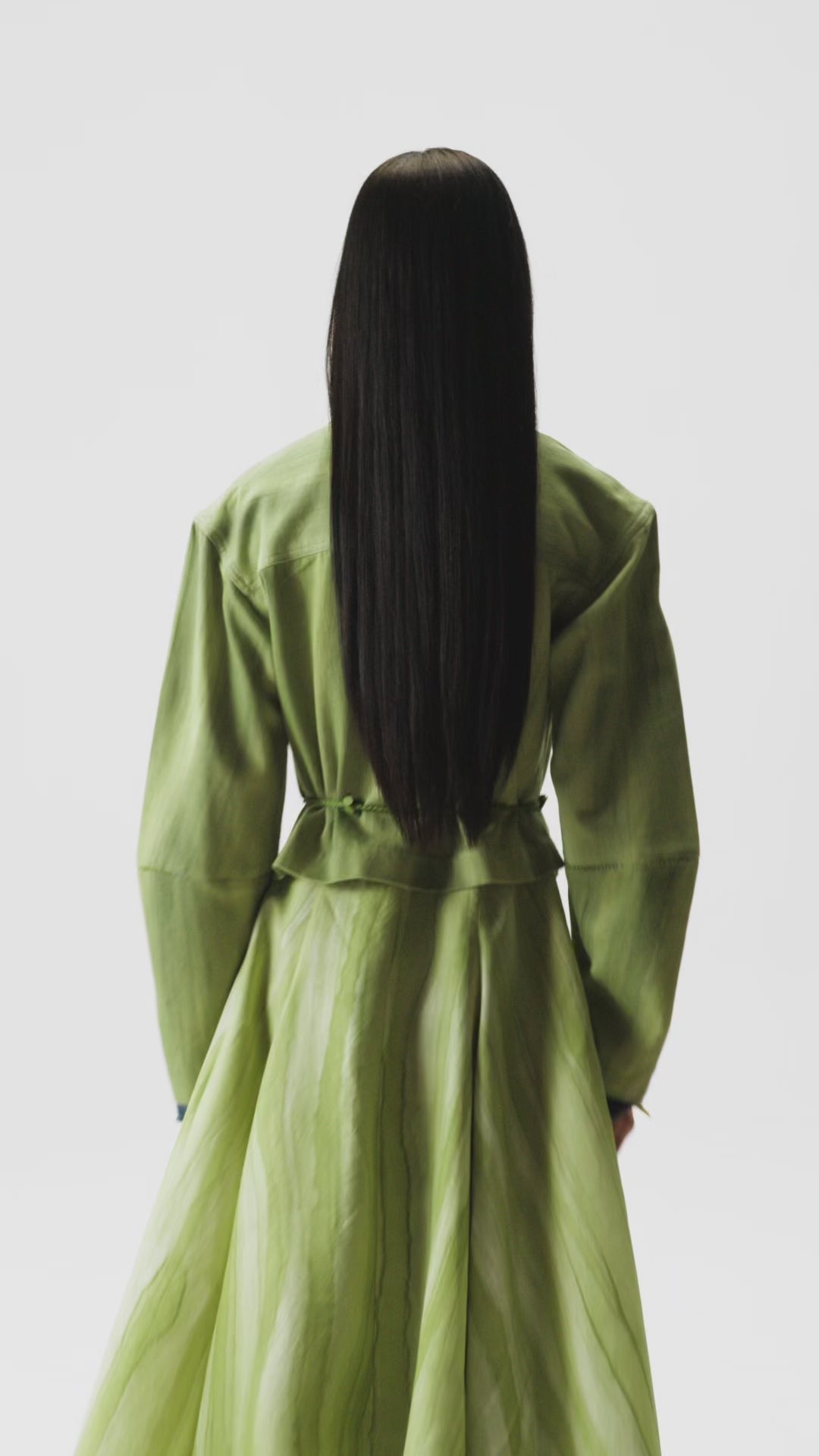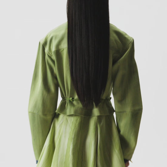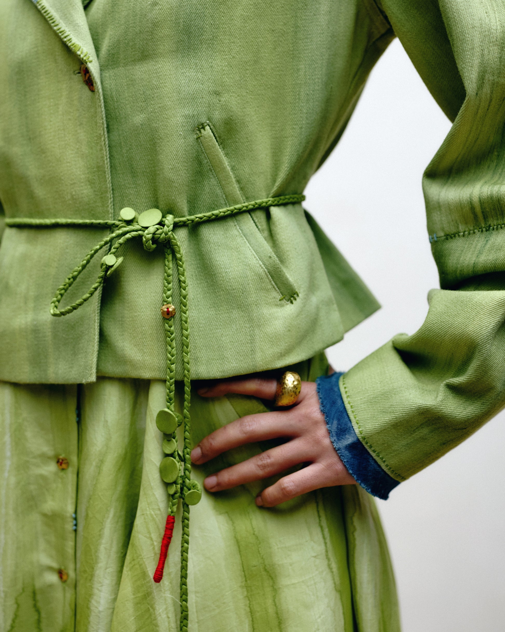 Handwoven cotton jacket with the surface hand-painted by brush, frayed edges and embroidered highlights.