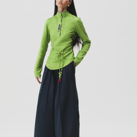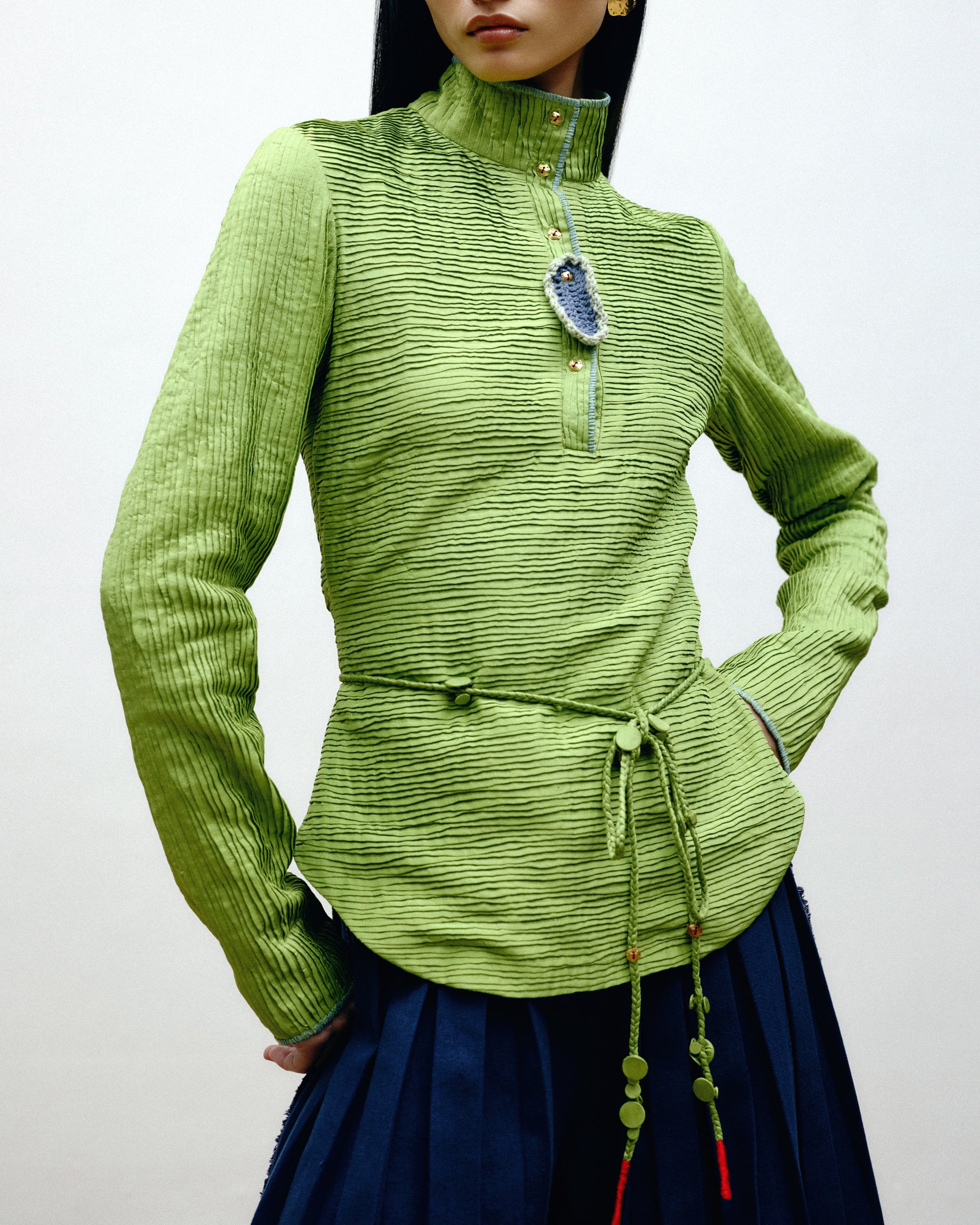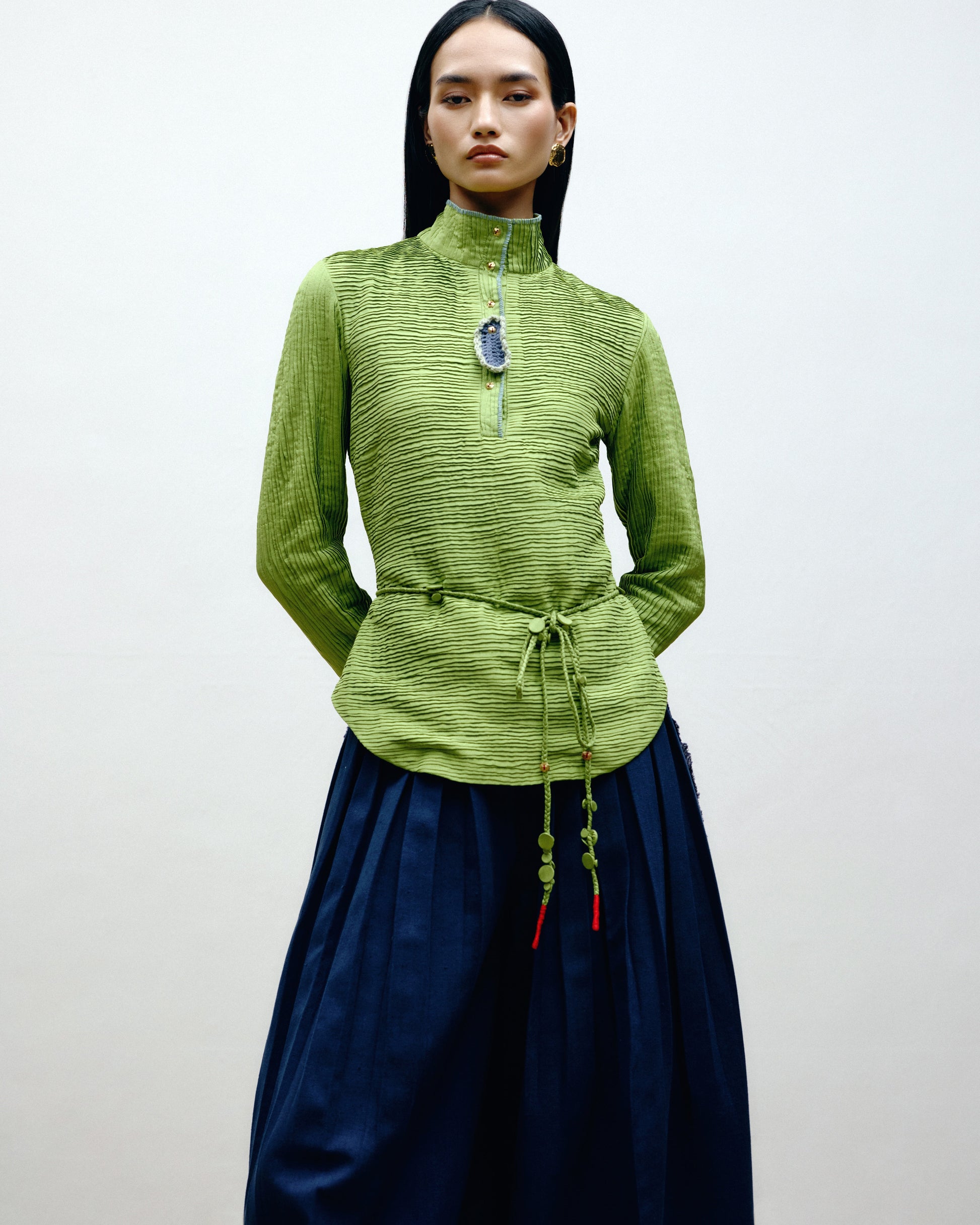Fitted Silk cami shirt with glove-length sleeves, a pin-tucked surface and hand-embroidered highlights.