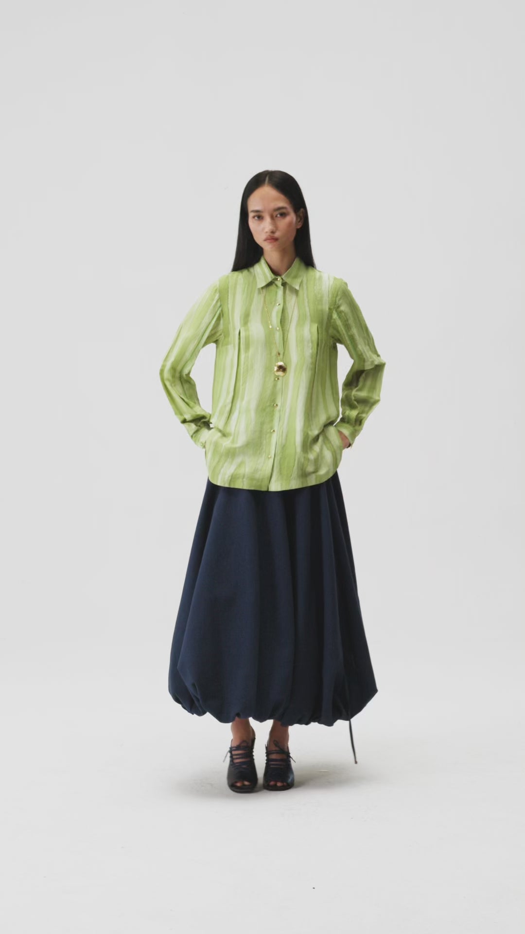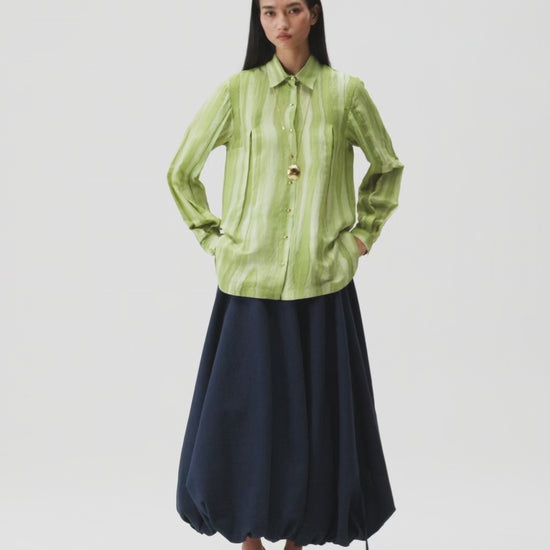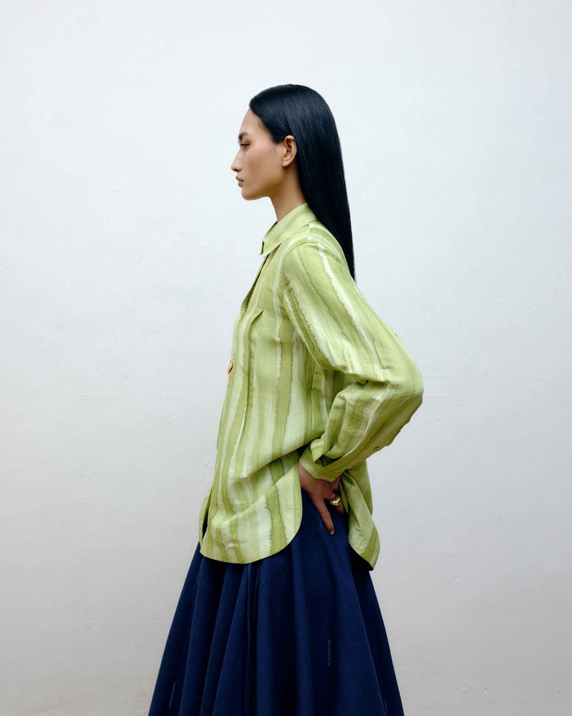Handwoven Mulberry silk shirt, with slot-seam detailing, hand-embroidered highlights and a surface painted by brush.