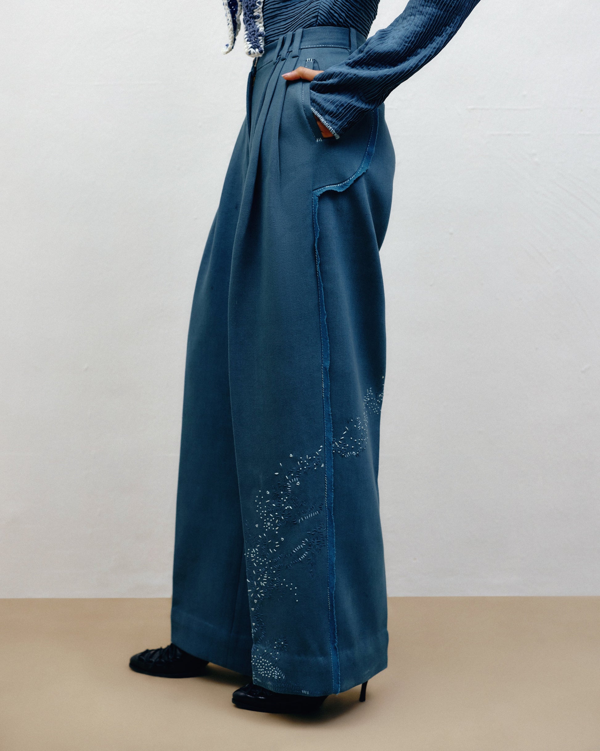 Handwoven cotton-denim trousers with hand-embroidered details.